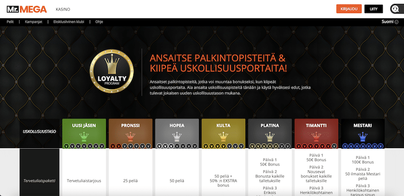 Mr Megan eksklusiivinen klubi perustuu palkintopisteiden keräämiseen ja niiden kautta niin sanottujen uskollisuusportaiden kiipeämiseen. Kun nouset uudelle tasolle, saat matalammilla tasoilla palkinnoksi ilmaiskierroksia ja vähän korkeammilla tasoilla myös bonusrahaa. Kaikista korkeimmilla tasoilla lahjat voivat nousta vielä hienommiksi eikä sivustoilla meille ”tavallisille tallaajille” kerrota muuta kuin että luvassa on henkilökohtainen tarjous henkilökohtaiselta tilinhoitajalta…