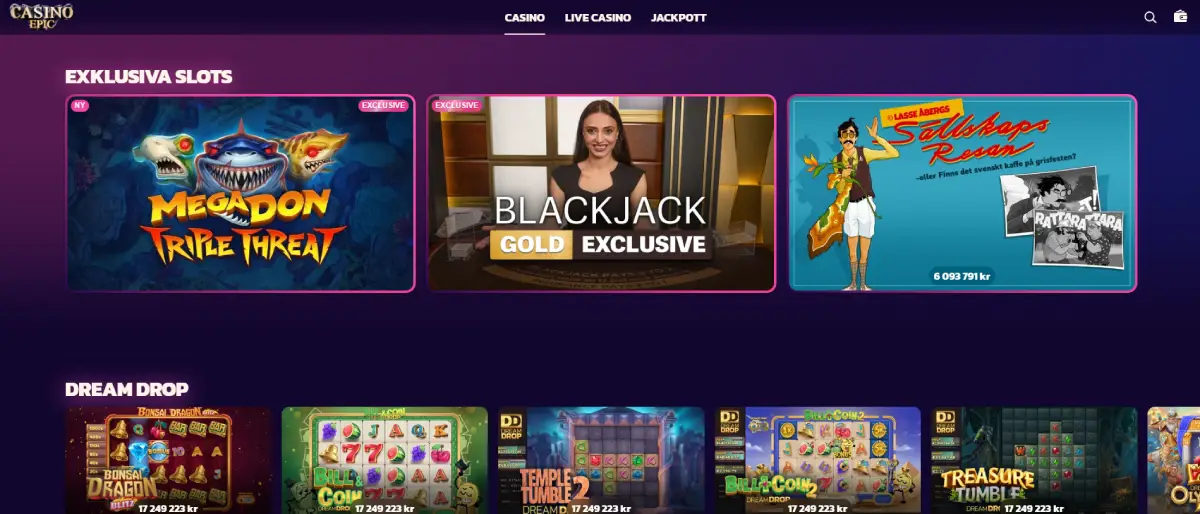 Casino Epic har det mesta du förväntar dig av ett casino online. Slots är förstås det huvudsakliga inslaget i deras spelutbud, men det finns även live casino, bordsspel och andra turspel.