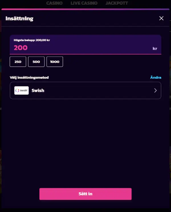 Insättningar är alltid snabba och avgiftsfria. I casinots FAQ läser vi att det lägsta möjliga uttaget ligger på en väldigt låg nivå: 15 kronor. Som max kan du ta ut 50 000 kronor under en 24-timmarsperiod. Vid vårt eget test tog vi ut 200 kr med Swish och pengarna satt på banken i stort sett direkt.