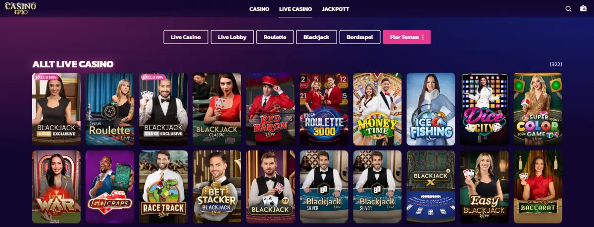I förhållande till Casino Epics totala storlek så är deras live casino faktiskt ganska rejält. Det finns en väldans massa bord att slå sig ner vid inom Baccarat, roulette och Blackjack.