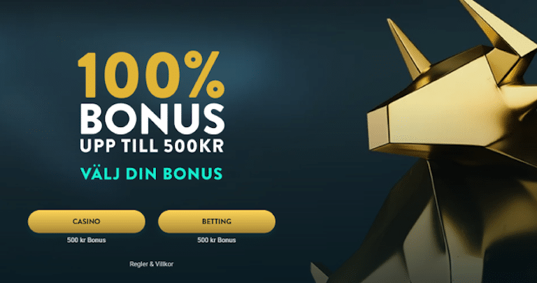 Golden Bulls välkomstbonus erbjuder 100% extra upp till 500 kr. Omsättningskravet för deras casinobonus är 30 gånger bonussumman. Samma storlek på bonusen gäller oavsett om du väljer casino- eller sportbonus, men reglerna skiljer sig åt.