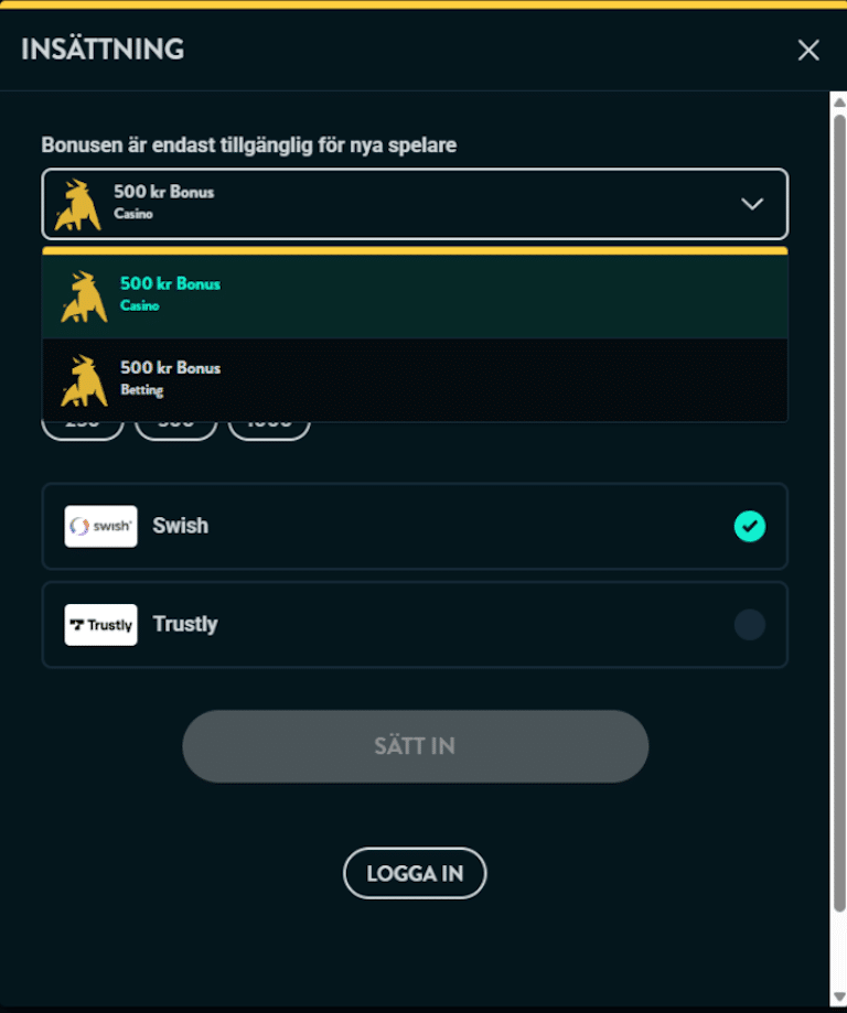 - Gör en insättning via Trustly eller Swish, med ett minimum på 200 kr. Jag testade båda för att få en ärlig bild.